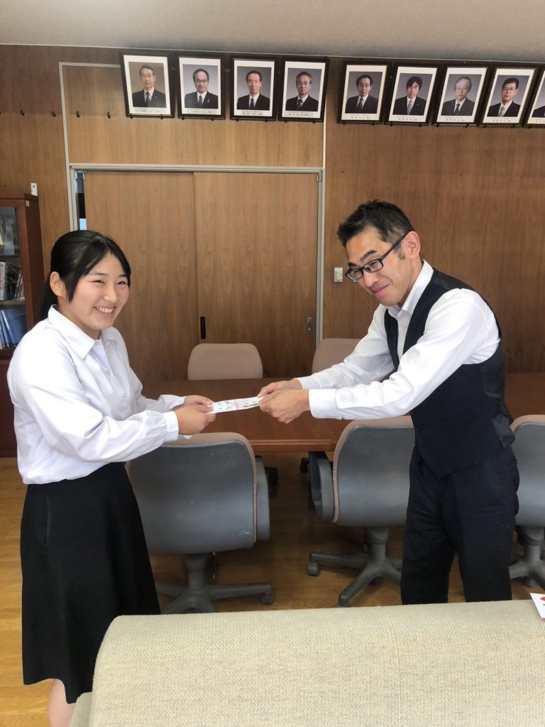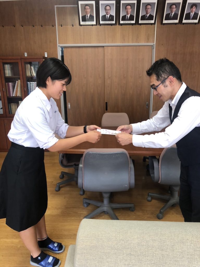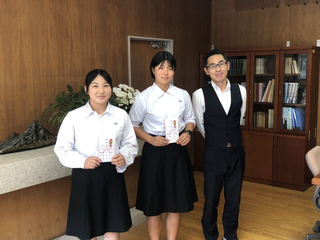 国民スポーツ大会に出場するアーチェリー部とボート部の選手に校長先生から激励金の授与を行いました。
