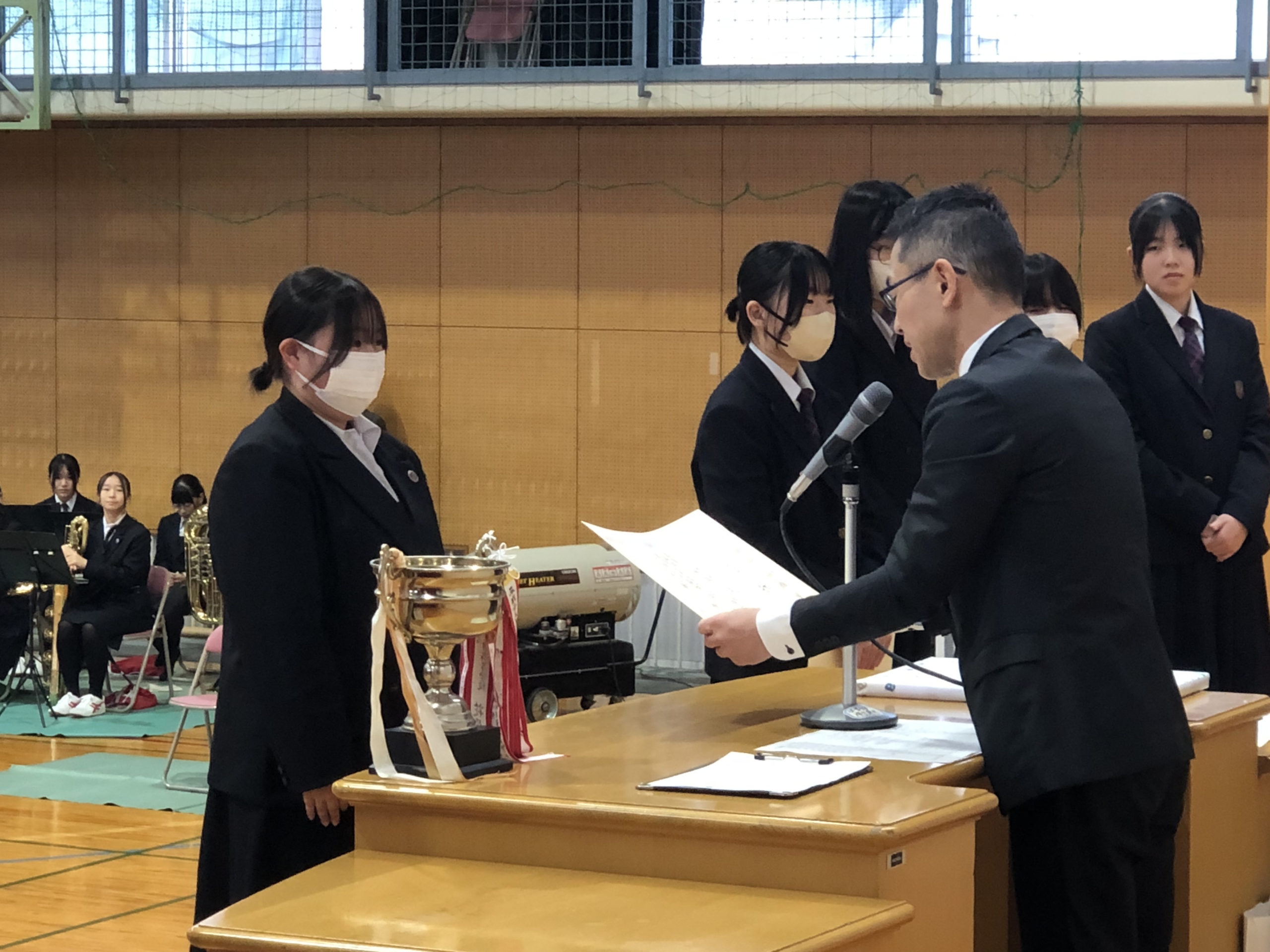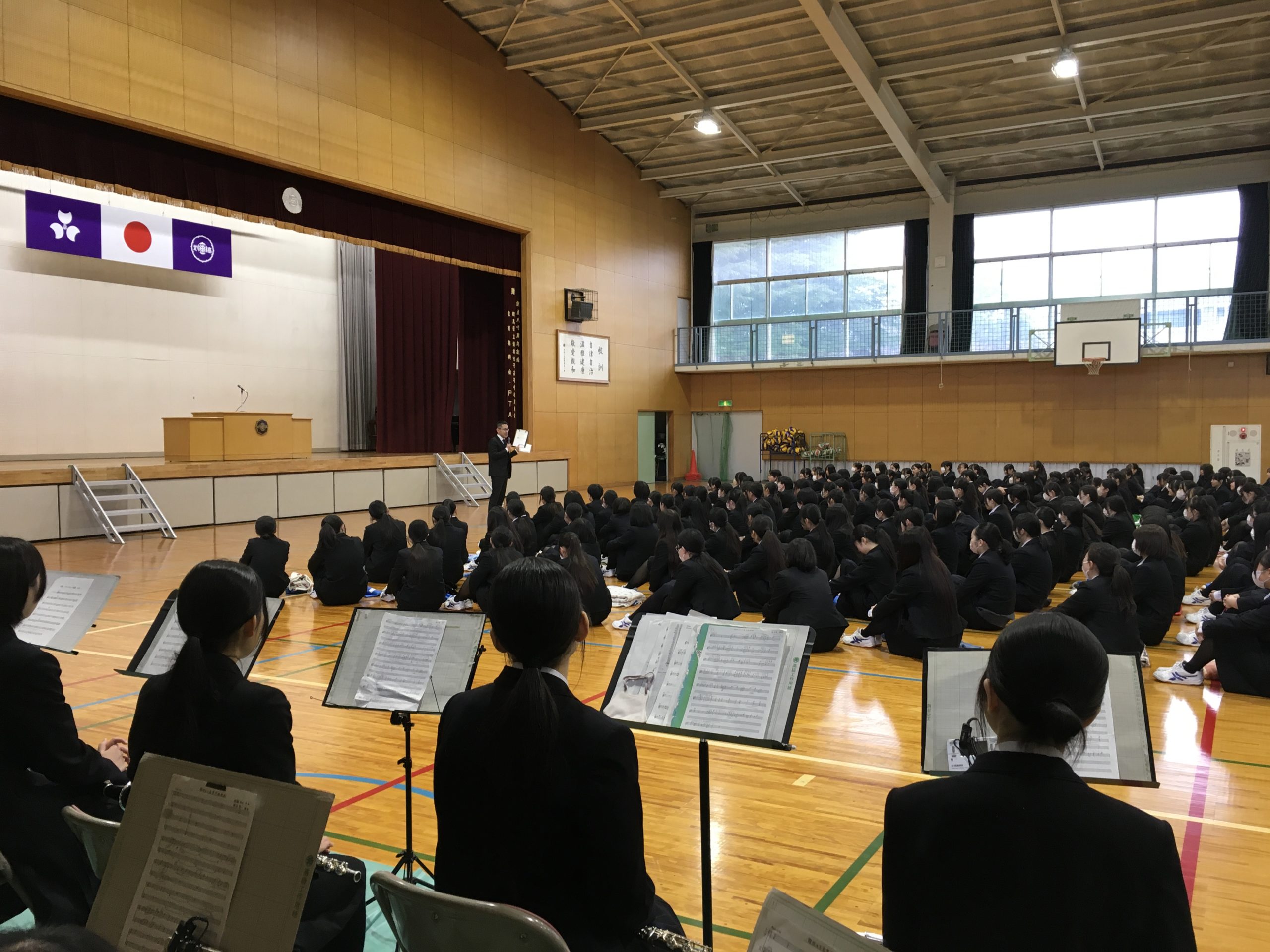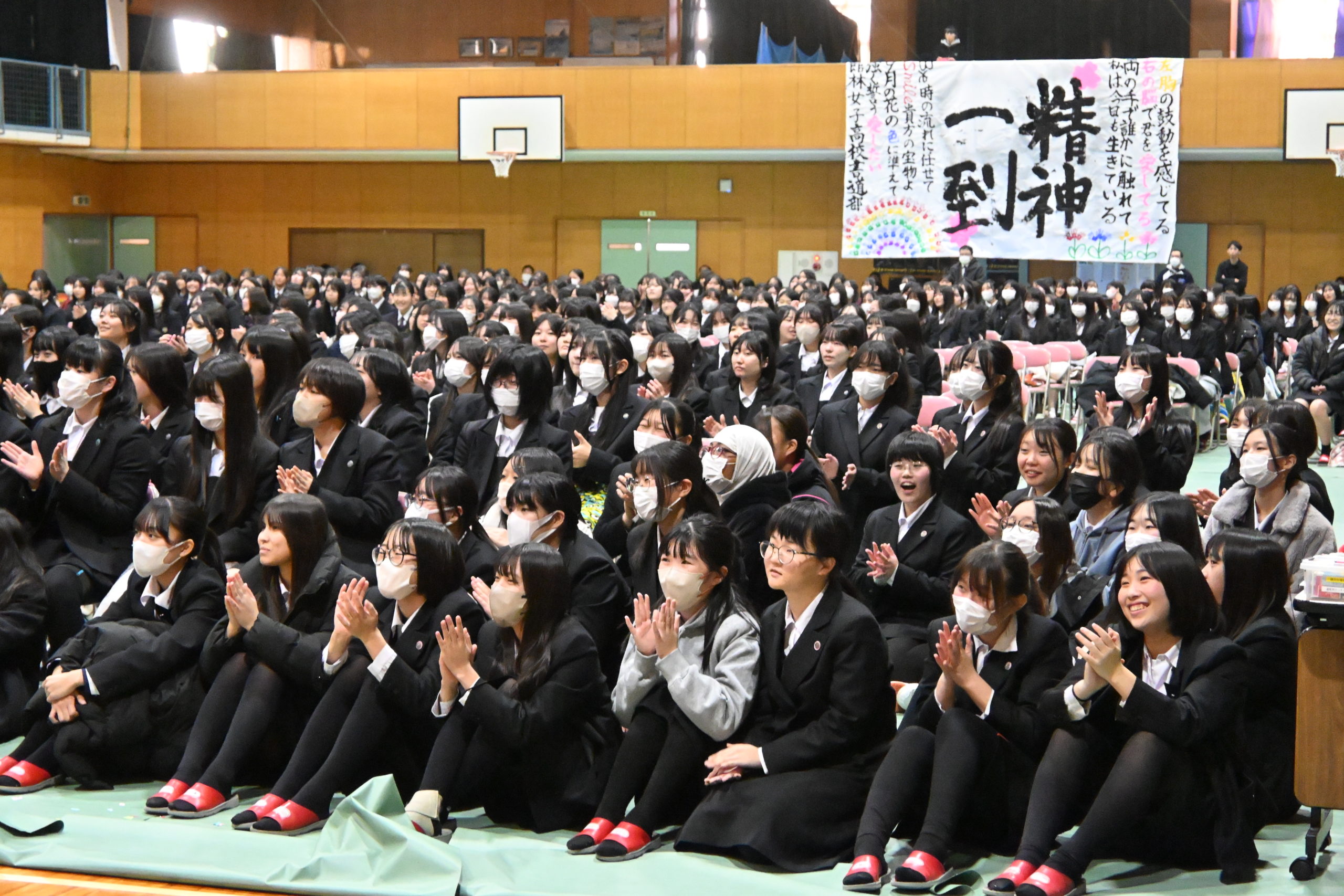 校長式辞では、校長先生が年度初めに「何か目標を立てて実現しましょう!」と話した際に、自身も「何か資格を取ります!」と公言した通り、資格試験に合格したことを生徒に報告しました。また、新年を迎えるにあたり「何か目標を立てて宣言しましょう!」という話をし、校長先生自身も「来年はフリースローを決めます!」と宣言していました。