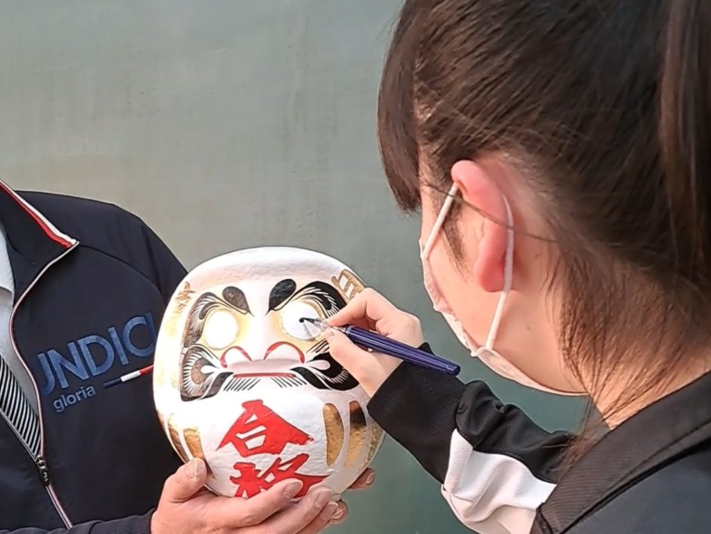 共通テストの前には、尾曳神社でお参りをし、だるまの目入れも行いました。