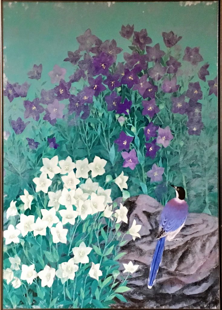 写真の作品名は「桔梗の庭」(日本画)である。校長室に展示された美しい作品である。作者は、宇木武子様であり、昭和20年11月~60年3月まで理科(化学・物理)教諭として在職していました。日本画の他、鎌倉彫りや水彩画などでも活躍されていました。